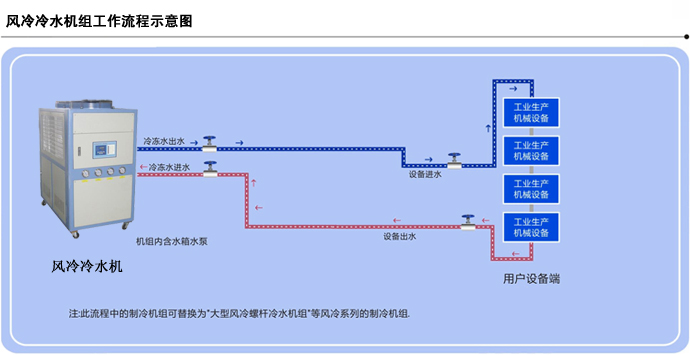 二、冰水機分類: 1、按冷凝器的種類分:水冷型冰水機[1]和風冷型冰水機兩種。 1-1、水冷型:冰水機外接冷卻水(需要安裝冷卻塔),將冷凝器中冷媒的熱量帶走。 水冷型冰水機具有壽命長,效率高,噪音低等特點,適合一些特定的環境及場所使用。 1-2、風冷型:冰水機裝有散熱風扇,通過風扇吸風將冷凝器中冷媒的熱量帶走。 風冷型冰水機具有安裝方便簡單,移動方便。但噪音比較大。效率比水冷型冰水機略差。 2. 按蒸發器的種類分:沉水式和殼管式(板換式)兩種。 2-1、沉水式:將蒸發器的銅管圈在水箱中實現制冷,水泵從水箱中抽水實現 循環。(特征:先制冷,后抽水) 2-2、殼管式:殼管式也叫板換式,把蒸發器做成一個長筒型罐子(或者用板式換熱器),水泵從水箱抽水注入蒸發器實現制冷。(特征:先抽水,后制冷) 2-3、按蒸發器的類型分,還有一些特殊用途的冷水機:因被冷卻的物 質具有腐蝕性或者被冷卻物質潔凈度要求比較高,它的蒸發器用 不銹鋼材料或者用塑膠+鈦管制成(電鍍行業),船用冰水機 (黃銅管+塑膠),食品、化妝品行業就要求潔凈度較好的冰水機。 3. 分體式冰水機:根據有些客戶又想使用風冷型冷水機因為安裝方便,又想噪音低,只有選用分體式冰水機,把風扇部分與主機部分拆分,放在室外(有點像家用的空調形式)。這樣就可以達到噪音低又可以便宜風冷型冰水機。 4、開放式冰水機:開放式冰水機只是水冷型冰水機的一種,就是把水冷型冰水機的外殼去掉這樣就可以更加地節省成本,把水箱放在開放式冰水機的邊上,但需要安裝兩臺循環水泵,一臺內循環一臺外循環水泵。 三、冰水機應用領域: 1、用用于食品,醫藥領域 2、應用于橡膠,塑膠,加工機械成型模具冷卻,能夠大大提高塑料制品表面光潔度,減少塑料制品表面紋痕和內應力,使產品不縮水、不變形,便于塑料制品的脫模,加速產品定型,從而極大地提高塑料成型機的生產效率; 3、應用于數控機床、坐標鏜床、磨床、加工中心、組合機床以及各類精密機床主軸潤滑和液壓系統傳動媒的冷卻,能夠精確地控制油溫,有效地減少機床的熱變形,提高機床的加工精度。 4、應用于化工行業、中央空調等領域。